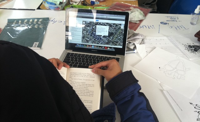Cartography: After finishing up the 3D globe project several weeks ago, we Skyped with a 7th grade class in New Hampshire who completed a similar project. We followed that with a digital project in participatory mapping, which asks contributors to add a small amount of geographic information to a public map that can be read by anyone – see the Interactive Map of 9/11 Memory at the New York Times for an example. This past week, we experimented with maps as art; projects ranged from emotional maps of the heart to maps of fictional worlds. (James created the Google map in the image above to document the world of Percy Jackson).