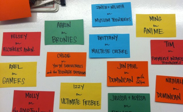 Sixteen: The final Sixteen documentaries will be shown in class on Wednesday and Thursday of this week! In addition to the topics above, the films document youth subcultures ranging from “Beliebers” (Justin Bieber’s fans) to “Potterheads” (Harry Potter fans) to “Sneakerheads” (those who collect, sell and trade sneakers). The films from this class – perhaps more than those from any other Sixteen class I’ve taught – truly represent an incredible combination of anthropology and documentary filmmaking. I’ve learned so much from watching them come together. Families – please consider joining us for the screenings at school on either Wednesday (12:50-2:20pm) or Thursday (9-10am).