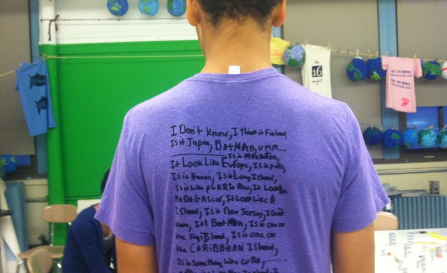 Above: For his final cartography project, Max located an Indonesian island in Google Maps and asked a number of people what they thought it was based on its silhouette. He screenprinted the island on the front of his shirt, and the back depicts the responses.