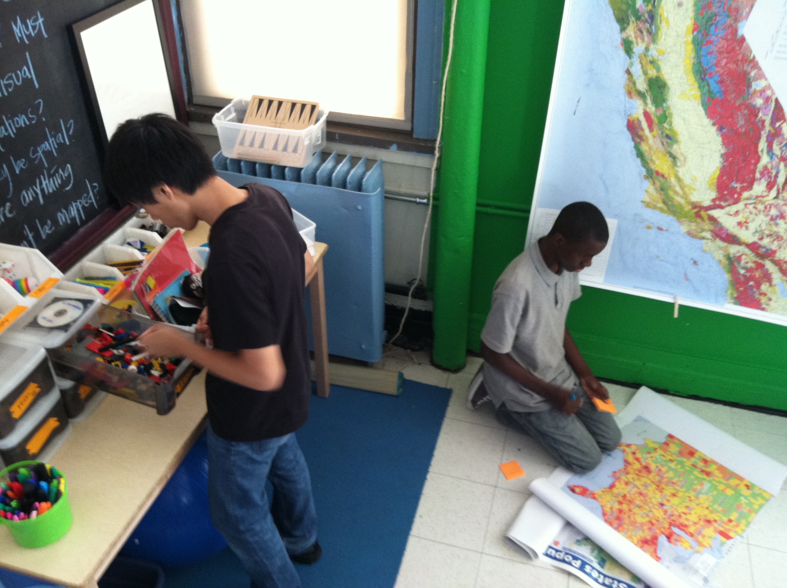 We have a huge map of California at a scale of 1in=12mi. Some took on the challenge of redrawing California at a scale of 1in=24mi using string, protractors + rulers; others drew Wyoming at the same scale by searching for the dimensions and doing the math.